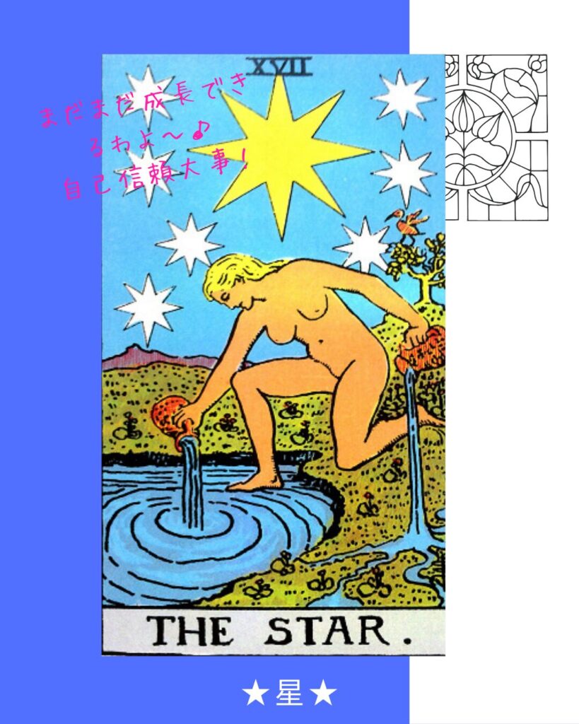星のカードの女性が裸であるように、見栄やプライドを脱ぎ捨てて「本当はどうしたい?」と自分に問いかけることが、再生の第一歩です。
